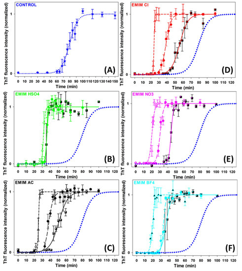 Graphic representation of insulin fibrillization in the absence (blue dotted line in (A–F)) and presence of (B) [EMIM+] [HSO4−], (C) [EMIM+] [AC−], (D) [EMIM+] [Cl−], (E) [EMIM+] [NO3−], (F) [EMIM+] [BF4−]. IL-concentrations: CIL = 10 mM (semi-filled square, solid line); CIL = 25 mM (circle, long-dash line); CIL = 100 mM (open triangle, short-dash line).