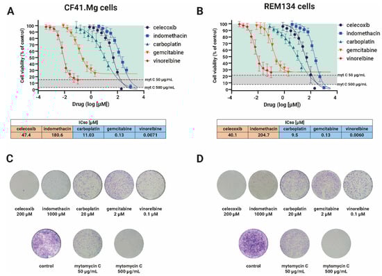 Figure 1C,D illustrate that there were remaining cells at higher concentrations of the antitumor drugs gemcitabine, vinorelbine, and carboplatin. With regard to the NSAIDs, celecoxib at a concentration of 200 µM was able to eliminate all cells, while a few cells remained after exposure to 1000 µM of indomethacin, which is consistent with the cell viability measurements.