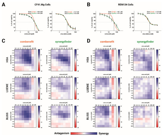 As anticipated, the HSA model was the least restrictive when determining synergy, as it assigned synergy scores to all combinations in both software. The Loewe model categorized the INDO+CRP and INDO+VRB combinations in CF41.Mg cells as antagonistic, but only when using Combenefit, while the Bliss model was more stringent in identifying synergy. Consequently, all indomethacin-based combinations were antagonistic in CF41.Mg cells, and the combinations of vinorelbine and gemcitabine with indomethacin were antagonistic in REM134 cells, in both software. All combinations with celecoxib were synergistic under all models, with the exception of the drug pair CLX+GCT, which was scored as additive (not synergistic or antagonistic) in CF41.Mg cells.
