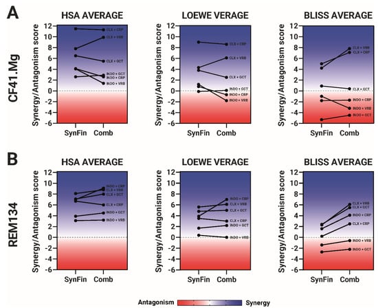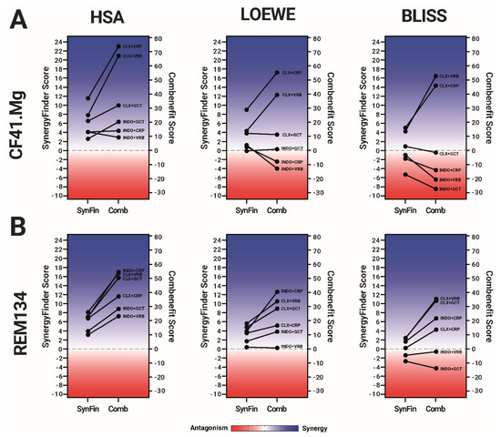 It is noteworthy that certain combinations exhibited a significant shift in the strength of synergy, and in some cases, a change in the classification from synergistic to antagonistic, depending on the software used. In CF41.Mg cells, the drug pairs CLX+CRP and CLX+VRB showed greater synergy when analyzed by Combenefit, under the Bliss model. This could be explained by the difference between the actual viability data that is below the fitted curve in the concentration range of 0.8 and 50 µM (