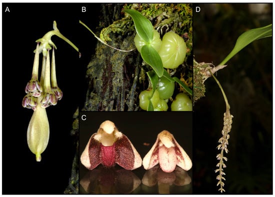 Two Bulbophyllum species with dimorphic flowers. Inflorescence with two types of flowers (A) and two-leaved pseudobulb (B) of B. physometrum, photos by Ron Parsons. Fertile (on the left) and sterile (on the right) flowers (C), and inflorescence (D) of B. mirabile, photos by Roland Amsler.