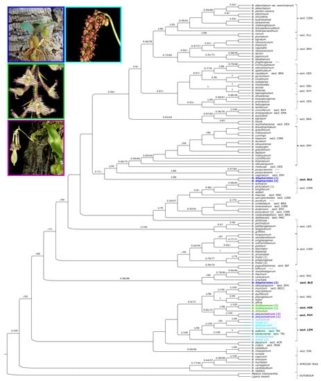 - Hu, A.-Q.; Gale, S.W.; Liu, Z.-J.; Suddee, S.; Hsu, T.-C.; Fischer, G.A.; Saunders, R.M.K. Molecular phylogenetics and floral evolution of the Cirrhopetalum alliance (Bulbophyllum, Orchidaceae): Evolutionary transitions and phylogenetic signal variation. Mol. Phylogenetics Evol. 2020, 143, 106689. [Google Scholar] [CrossRef]
