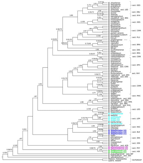 - Hosseini, S.; Dadkhah, K.; Go, R. Molecular systematics of genus Bulbophyllum (Orchidaceae) in Peninsular Malaysia based on combined nuclear and plastid DNA sequences. Biochem. Syst. Ecol. 2016, 65, 40–48. [Google Scholar] [CrossRef]