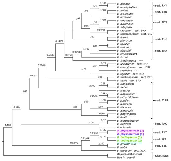 The maximum clade credibility tree obtained for dataset of matK gene showing the phylogenetic position of the Asian monotypic section Physometra. The numbers above branches indicate values of posterior probability and bootstrap support (PP/BS). Sectional placement for particular studied taxa is shown behind the taxon name or bracketed together as abbreviations of three or four letters: ACR−Acrochaene, BECC−Beccariana, BIF−Biflorae, BRA−Brachyantha, BLE−Blepharistes, CIRR−Cirrhopetalum, DES−Desmosanthes, EBU−Eublepharon, EMA−Emarginatae, EPH−Ephippium, HIR−Hirtula, ION−Ione, LEM−Lemniscata, LEO−Leopardinae, MAC−Macrostylida, MON−Monomeria, PHY−Physometra, PLU−Plumata, RAC−Racemosae, RHY−Rhytionanthos, SES-Sestochilos, TRI−Tripudianthes. However, lack of section placement is denoted as ----. The sections discussed are highlighted in a color other than black.
