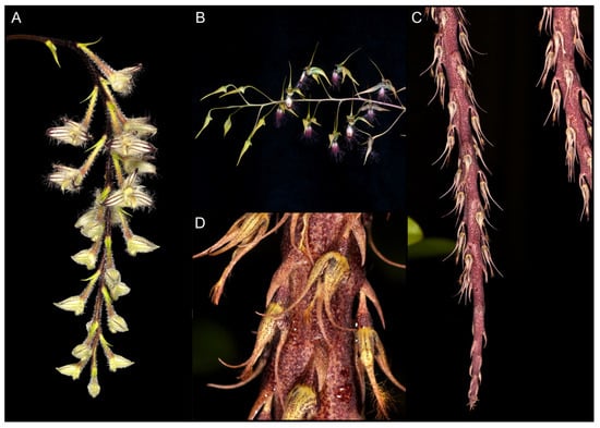 Finally, an example of flower dimorphism is the presence of sterile flowers. They are often highly transformed, so that they are significantly different from those that perform reproductive functions. In addition to the various functions that sterile flowers can serve, such as male flowers in trap inflorescences in Araceae [,], studies indicate that the presence of sterile flowers paradoxically increases pollinator visits and promotes reproductive success [,,]. Within the orchids, such a phenomenon can also be observed. An example is the species of the Neotropical genus Heteranthocidium Szlach., Mytnik & Romowicz. In representatives of this taxon within a single inflorescence, some of the flowers are stellate and sterile []. Another example is Bulbophyllum physometrum. However, here, only one terminal flower in the inflorescence is sterile; moreover, the major difference is due to the significant enlargement of the ovary, so that it looks like a seed capsule []. Although this phenomenon is rare in orchids, there is another species of the genus Bulbophyllum exhibiting sterile flowers syndrome: B. mirabile (section Hirtula) []. In this case, however, the flowers vary in the size and structure of the perianth, such as the lip, depending on their position on the inflorescence. Flowers located at the top are usually sterile, while those in the basal part are normally developed (Figure 1). Phylogenetic analyses indicate that B. physometrum is related to representatives of the section Hirtula, i.e., B. lindleyanum and B. hirtula (Figure 2). However, the previously indicated differences in flower dimorphism, as well as inflorescence structure, may suggest independent evolution of the flower dimorphism phenomenon in both species. The rachis of B. physometrum is spindle-shape, shortened, and somewhat swollen at the apex, while B. mirabile has an elongated and cylindrical rachis, clearly swollen near the middle. Finally, B. physometrum has a two-leaved pseudobulb, while representatives of the section Hirtula are characterized by a one-leaf pseudobulb [,].