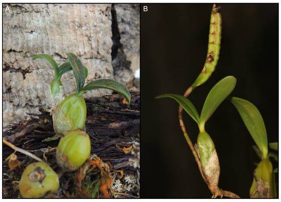 Bulbophyllum species with two-leaved pseudobulb: B. blepharistes (A) and African B. cf. scaberulum (B). Photos by Sławomir Nowak (A) and Roland Amsler (B).
