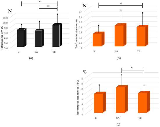 2.4. Comparative Analysis of the Percentage and Total Number of Monocytes with FcγRI-III and/or CR1, 3, and 4 in Peripheral Blood of SA and TB Patients