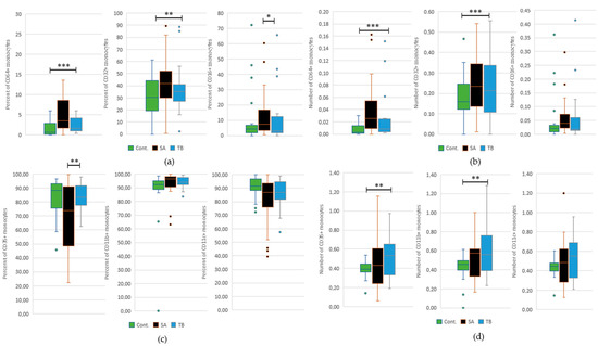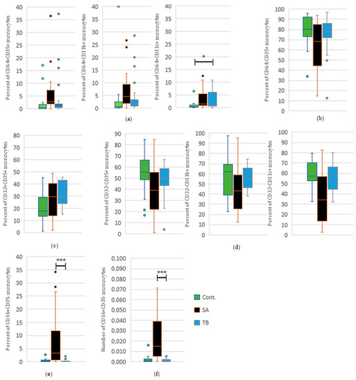 2.1. Presence of Monocytes in Peripheral Blood from SA Patients, TB Patients, and Healthy Control