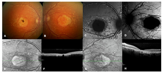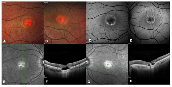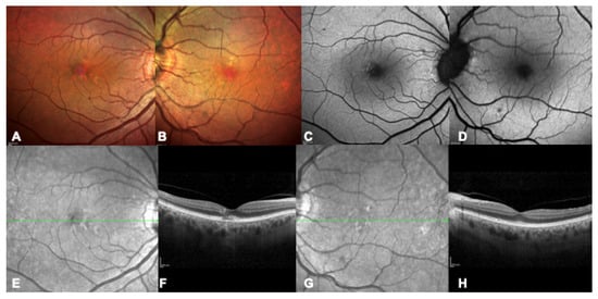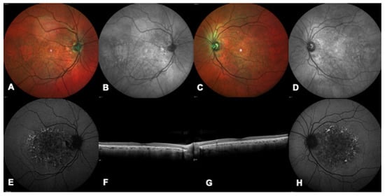 Multimodal imaging of a patient with a confirmed genetic diagnosis of ABCA4-related macular dystrophy. (A,B) Bilateral multicolor fundus images showing yellow flecks and advanced macular atrophy. (C,D) Bilateral blue autofluorescence showing macular hypoautofluorescence consistent with an advanced stage of the disease. (E–H) Bilateral infrared images show diffused flecks and foveal atrophy and bilateral OCT highlights loss of outer retinal layers and absence of foveal layers.