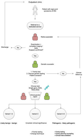Genetic testing is indicated in a patient with a presumed diagnosis of IRD on the basis of clinical and instrumental findings, but it must not be used to exclude an IRD, as a negative result could reflect the limits of the analyzing technique (i.e., limited panel of genes) [58]. In some instances, no disease-related variants are found, possibly because the pathogenic defect lies in an unknown gene or in a region that is not covered by the sequencing technique.