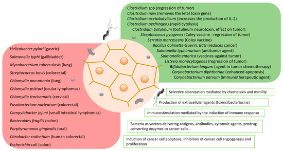- Al-Hilu, S.A.; Al-Shujairi, W.H. Dual role of bacteria in carcinoma: Stimulation and inhibition. Int. J. Microbiol. 2020, 76, 1. [Google Scholar] [CrossRef]