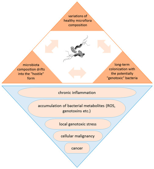 In addition to H. pylori, there are several other bacterial species that are commonly discussed as associated or even being causative agents (triggering factors?) of cancer (Table 1). Among them are Salmonella typhi, which is considered as linked to hepatobiliary carcinoma and gallbladder cancer, Campylobacter jejuni (small intestinal lymphomas), Chlamydia psittaci (ocular lymphomas), Mycobacterium tuberculosis and Chlamydia pneumonia (lung cancer), Fusobacterium nucleatum, Bacteroides fragilis, Streptococcus bovis and Citrobacter rodentium (human colorectal cancer), Chlamydia trachomatis (cervical cancer), Porphyromonas gingivalis (pancreatic and oral cancer), and some others (Figure 1). These bacteria are usually found in the altered microbiota of the damaged tissues of cancer patients. There are many investigations demonstrating that these bacteria secrete virulence factors resulting in oxidative stress, chronic inflammation, and host DNA damage that can promote carcinogenesis. It is still unclear whether quantitative or qualitative changes in the taxonomic composition of the bacterial microbiota caused by the harmful effects of the environment lead to the development of the disease, or, conversely, the disease causes a transformation of the microbiota composition, shifting it to the “unfriendly”, hostile form. However, the long-term colonization of the tissue by the bacterial species that are able to cause local genotoxic (DNA-damaging) stress can lead to cellular transformation and ultimately to cancer development (Figure 2) [7,45,46,47].