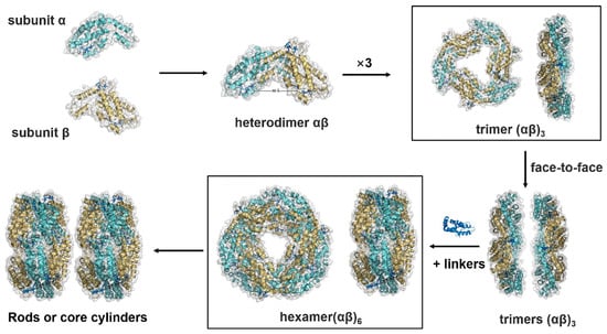 Apoprotein assembly of basic PBS cylinders. α- and β-subunits firstly form a heterodimer αβ as monomers for phycobiliprotein assembly. Three monomers aggregate into the ring-shaped trimer (αβ)3 in a head-to-tail manner. Two trimeric disks attach to each other on the α-ring side in a face-to-face manner to form a hexameric (αβ)6 disk, which are connected with linker proteins. Such hexamers serve as a basic unit for the assembly of the peripheral rod or core cylinders.