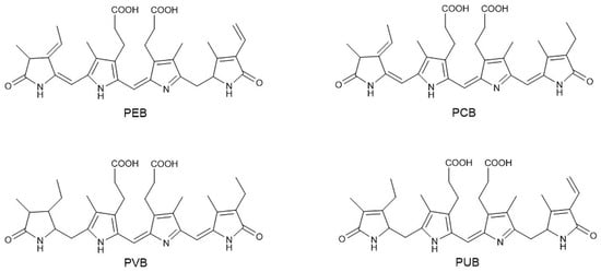 The four main types of phycobilins in algae. Linear open-chain tetrapyrroles make up the main chemical skeleton of phycobilins. These four pigments are isomers, and the position and number of double bonds lead to differences in the spectroscopic properties among phytochromes. PEB—phycoerythrobilin; PCB—phycocyanobilin; PVB—phycoviolobilin; PUB—phycourobilin.
