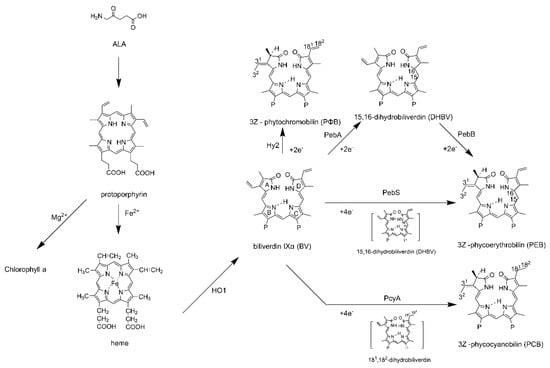 In photosynthetic light-harvesting complexes, the main chromophore is the tetrapyrrole derivative. The abundant light-harvesting pigment in plants is chlorophyll, a cyclic tetrapyrrole chromophore. However, in addition to the cyclic tetrapyrrole, there are some open-chain tetrapyrrole chromophores called phycobilins in cyanobacteria. Eight types of phycobilins have been identified [22], of which four (PEB, PCB, PUB, and PVB) are common. The precursor substance of phycobilins is haem, which can be synthesised by haem oxidase (HO) and ferredoxin-dependent bilin reductases (FDBRs) [23]. Aminolevulinic acid (ALA) is converted to protoporphyrin through multistep enzymatic reactions. Protoporphyrin ring chelates Fe2+ to produce haem. Subsequently, the haem unravels the closed-chain tetrapyrrole ring, catalysed by haem oxidase, and removes Fe2+ to produce the open-chain tetrapyrrole molecule biliverdin IXα (BV), which is then transformed into various phycobilins (in cyanobacteria and red algae) by FDBRs (Figure 3).