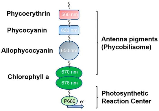 The light energy absorbed by phycobilins is efficiently transferred among PBPs. Energy is transferred through fluorescence resonance between subunits, then transmitted uniaxially to inferior PBP rods, and finally reaches the reaction centre located in the thylakoid. These PBPs are spatially arranged to allow directional energy transfer from PEC or PE to PC within the rod and then to APC in the core [21]. Chlorophylls capture the energy and transport it to the photosynthetic electron transport chain at an efficiency higher than 95% [27,28] (Figure 4).