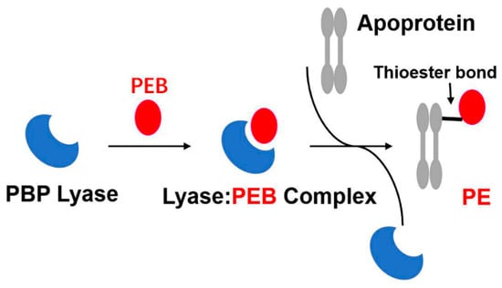 A model for the catalysis of lyases. Particular lyases recognise and combine with corresponding phycobilins to form the lyase—phycobilin complex. Subsequently, the apoprotein (usually the PBP monomer) is activated and integrates a bilin molecule at the conserved cysteine residue via a thioether bond. PBP—phycobiliprotein; PEB—phycoerythrobilin; PE—phycoerythrin.