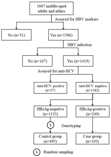 The subjects of this study were selected from participants in our previous community-based study [15]. From September 2010 to May 2012, a total of 1607 middle-aged adults and elders voluntarily gave informed consent and received physical examinations. At the date of enrollment, a fasting blood sample was drawn from each participant for clinical evaluation and to determine their HBV markers, including HBsAg, HBcAb, HBsAb, and antibody to hepatitis C virus (anti-HCV). Out of the 1607 participants, 1382 individuals who were positive for at least one of the three HBV markers and negative for anti-HCV were eligible for the genetic association study (Figure 1). Among 249 HBsAg-positive subjects, 193 had DNA samples for genotyping and were included as cases. The controls were 495 subjects randomly selected from those who had DNA samples and tested negative for HBsAg but positive for HBcAb and/or HBsAb (Figure 1).