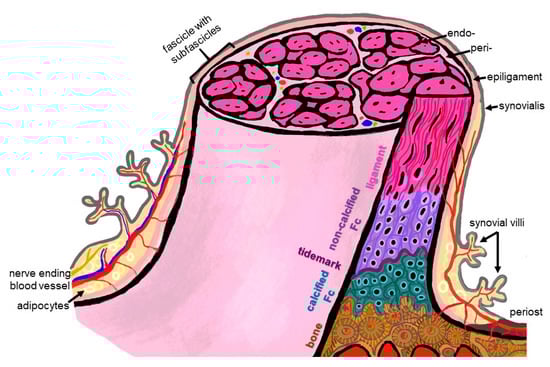 Since the enthesis acts as a functional unit allowing stress dissipation from the stretched ligament to its bone attachment sites, an organ concept arose: in the case of the enthesis of the Achilles tendon, it has been designated as an organ underlining the synergistic function of the different tissues (including the fat pad, fibrocartilage and synovial structures) forming and surrounding the enthesis [17]. This concept is transferable to the ACL entheses, where similar neighboring tissues (Hoffa fat pad, synovial fold and fibrocartilage) might contribute to their overall functions and homeostasis. An enthesis of the most common fibrocartilaginous type comprises four tissue compartments of increasing stiffness (ligament, non-calcified and calcified fibrocartilage, separated by the tidemark as a barrier between both and the underlying bone), generating a biomechanical gradient at the attachment to bone (Figure 2). The borders between the zones show undulating interdigitations [18], increasing the overall surface of contact areas and hence providing sufficient stability for repetitive loading. The tidemark is also a barrier between two nutrient diffusion fronts, from the subchondral bone and from the vascularized ACL midsubstance and outer synovial layer [19,20,21].
