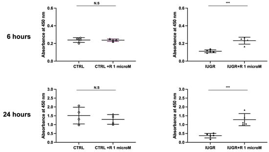 The measurement of 3H thymidine incorporation as cells enter the S phase has long been the reference method for the detection of cell proliferation. However, this technique requires the quantification of 3H thymidine using scintillation counting or autoradiography. Therefore, an alternative approach has been developed in which BrdU, a thymidine analog, replaces the 3H thymidine. We measured the proliferative capacity of the CTRL ± R (n = 4) and IUGR ± R (n = 5) ECFCs (20,000 cells/well) after 6 and 24 h using a colorimetric cell proliferation ELISA test based on the incorporation of BrdU into newly synthesized DNA strands of actively proliferating cells (Roche diagnostics, Basel, Switzerland). Each experiment was performed in duplicate [11].