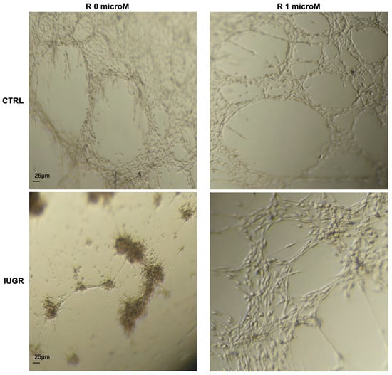 The development of capillary-like structure in ECFCs was assessed using Matrigel™ BD Growth factor (Becton, Dickinson and Company, Franklin Lakes, NJ, USA). Aliquots of Matrigel were prepared on ice under sterile conditions. Then, we proceeded to coat the 96-well plates with Matrigel (50 μL per well). The CTRL ± R (n = 4) and IUGR ± R (n = 5) ECFCs were seeded at a concentration of 20,000 cells/well into the 96-well plates coated with Matrigel. Each experiment was performed in duplicate. After 24 h, pictures were blindly obtained using an inverted microscope (Eclipse Ti2 Series) by the same examiner (E.G.) [11].