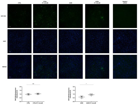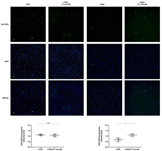 Basal NO production. Measurement of NO production using DAF-2DA was performed using the CTRL ± R and IUGR ± R ECFCs isolated from six-month-old male rats under baseline conditions. Magnification = 20×. Nuclei were counterstained with 4′6-diamidino-2-phenylindole (DAPI). A negative control was performed. These pictures are representative images from n = 4–5 animals/group; ** p < 0.01; N.S.: not significant. Scale bar = 100 μm. R: resveratrol.
