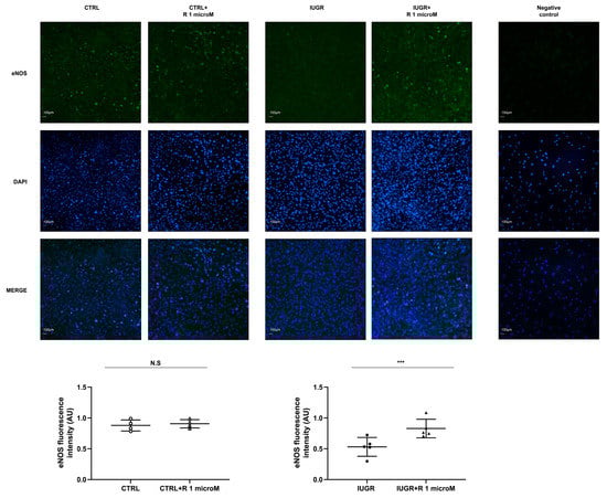 eNOS protein expression. eNOS protein expression was measured using immunofluorescence in the CTRL ± R and IUGR ± R ECFCs isolated from six-month-old male rats. Magnification = 20×. Nuclei were counterstained with DAPI, and a negative control was performed. These pictures are representative images from n = 4–5 animals/group; *** p < 0.001; N.S.: not significant. Scale bar = 100 μm. R: resveratrol.