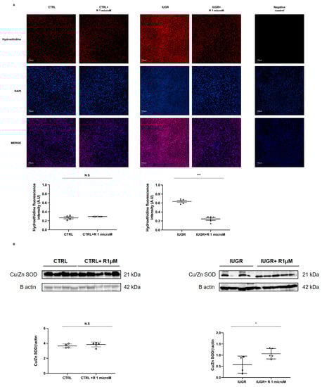 Superoxide anion production was measured using the oxidative fluorescent dye hydroethidine. In the presence of superoxide anions, hydroethidine is oxidized to fluorescent ethidium bromide, which is trapped in DNA by intercalation. The superoxide anion production of the CTRL ± R (n = 4) and IUGR ± R (n = 5) ECFCs was evaluated by incubating them with hydroethidine (2 μM; Sigma-Aldrich) and then mounting them on slides with fluoromount-G mounting medium-DAPI (Life Technologies). A negative control was established through incubation without hydroethidine. The fluorescence of superoxide anions was normalized to the DAPI fluorescence, and the autofluorescence was subtracted. Each experiment was performed in duplicate. The images at ×20 magnification were blindly obtained using an inverted fluorescent microscope (Eclipse Ti2 Series) and analyzed with ImageJ software (Java 1.8.0_112) by the same examiner (E.G.) [11].