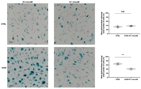 SA-β-gal activity in the ECFCs. The SA-β-gal activity determined as the blue staining normalized to the total number of cells in the CTRL ± R and IUGR ± R ECFCs isolated from six-month-old male rats. Magnification = 20×. These pictures are representative images from n = 4 animals/group; *** p < 0.001. Scale bar = 100 μm. N.S.: not significant. R: resveratrol.
