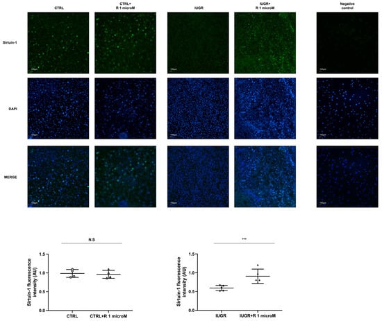 Sirtuin-1 expression. Sirtuin-1 expression was measured by immunofluorescence in the CTRL ± R and IUGR ± R ECFCs isolated from six-month-old male rats. Nuclei were counterstained with DAPI, and a negative control was performed. Magnification = 20×. These pictures are representative images from n = 4–5 animals/group; *** p < 0.001; N.S.: not significant. Scale bar = 100 μm. R: resveratrol.