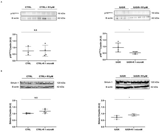 We measured the expression of two senescence markers: Sirtuin-1 and the cyclin-dependent kinase (CDK) inhibitor p16INK4a. Resveratrol treatment of the IUGR-ECFCs increased Sirtuin-1 protein expression according to the Western blot and immunofluorescence results (+24%; p < 0.05 and +52%; p < 0.001, respectively) (Figure 8 and Figure 9) and decreased p16INK4a protein expression (−43%; p < 0.05) (Figure 9). In the CTRL-ECFCs, no effect of resveratrol was observed concerning the SA-β-gal activity, or Sirtuin-1 and p16INK4a protein expression (Figure 7, Figure 8 and Figure 9).