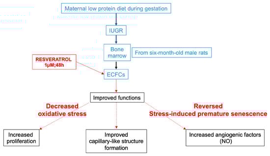 The present study is, to our knowledge, the first to demonstrate that an in vitro resveratrol treatment can reverse the ECFC dysfunctions at 6 months of age in male rats born after IUGR. In fact, resveratrol improved the proliferation and the capillary-like structure formation of ECFCs and increased their NO production and eNOS expression. These positive effects of resveratrol on IUGR-ECFC function were associated with decreased oxidative stress and reversal of SIPS (Figure 10).