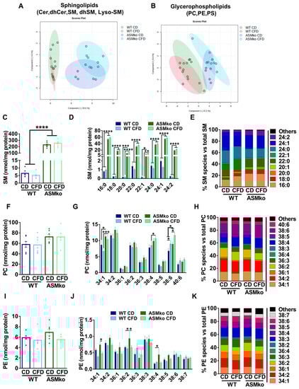 To determine if the wt and ASMko mice could be segregated according to their sphingolipidomic and/or glycerophospholipidomic composition in the liver, we performed a Partial Least Square Discriminant Analysis (PLS-DA) of the data. As expected, ASM deficiency changed the overall lipidomic composition in the liver compared to wt (Figure 2A,B). Choline deprivation further segregated the lipidomic composition in both mouse genotypes (Figure 2A,B). Analysis of total SM levels confirmed the drastic increase (35.6-fold) in control diet-fed ASMko mice compared to wt [22] (Figure 2C). Choline deprivation reduced SM levels in the wt mice (1.3-fold reduction) but did not significantly change the SM accumulation in the ASMko mice (Figure 2C). SM comprises a heterogenous group of species differing in their fatty acid length and degree of saturation. Different levels of accumulation and toxicity depending on the organ has been recently reported for specific SM species in the ASMko mice [24]. We thus analyzed the levels of the different SM species in the liver of control- and choline-free diet fed ASMko and wt mice. The levels of all SM species increased in the ASMko mice compared to wt (Figure 2D). The choline-free diet did not change the levels of any of the species in the ASMko mice, but reduced SM species with longer chain fatty acids (22–24 carbons) in the wt mice (22:0: 1.4-fold; 22:1: 2.2-fold; 24:0: 1.3-fold; 24:1: 1.6-fold; 24:2: 1.4-fold) (Figure 2D). This SM species-specific effect of the choline-free diet in the wt mice altered the relative abundance of the individual SM species. By increasing the relative abundance of short SM species (16:0 and 18:0) and decreasing the longer ones (24:1), the choline-free diet rendered the SM species profile in wt mice similar to that in ASMko mice, although the overall abundance of SM remained much lower in the wt mice (Figure 2E). Choline deprivation did not affect the levels of other sphingolipids (LysoSM, dhSM, Cer and dhCer) in wt and ASMko mice (Figure S1A–D).