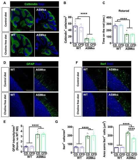Inflammation in the cerebellum was monitored by immunocytochemical staining of the astrocytic marker GFAP and the microglia marker Iba-1. Increased GFAP intensity (3.4-fold) (Figure 5D,E) and greater number and size of microglia (2.9-fold and 3.8-fold, respectively) (Figure 5F,G) evidenced astrocytosis and microgliosis in the ASMko compared to wt mice fed with control diet. Choline-free diet did not affect GFAP intensity (Figure 5D,E), nor microglia number in the ASMko mice, but significantly reduced microglia size (1.4-fold) (Figure 5F,G), indicating a reduction in the activation of these cells. Choline deprivation did not have overt effects on astrocytes (Figure 5D,E) or microglia (Figure 5F,G) in the wt mice.