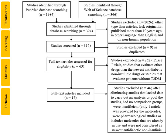 The studies will be included after searching in two databases, MEDLINE (using PubMed) and Web of Science, using the Boolean operators “AND” and “OR”, and the search strategy: “(efficacy OR safety) AND (novel antidiabetic drugs)”. The inclusion and exclusion criteria are as follows: