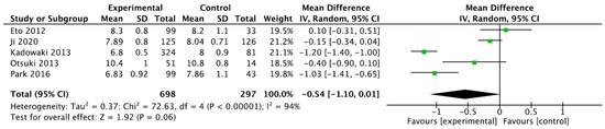 Forrest plot graphic representation of HbA1c for tenegliptin [32,33,34,35,36]. Green square represents the mean value for each study. Black square represents the mean value of the studies.