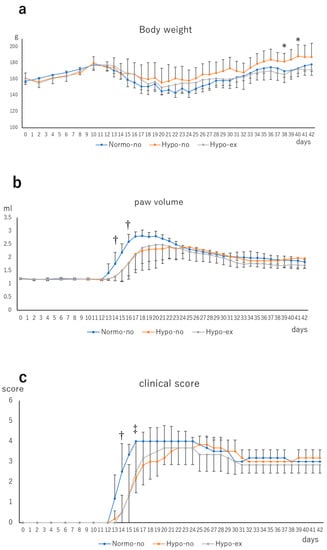 Temporal changes in body weight (a), paw volume (b), and clinical score (c) after immunization. All parameters were measured once every other day until day 12 and every day thereafter. * Hypo-no vs. Hypo-ex, p < 0.05; † Normo-no vs. Hypo-no, Hypo-ex, p < 0.05; ‡ Normo-no vs. Hypo-no, p < 0.05. n = 6 in each group.