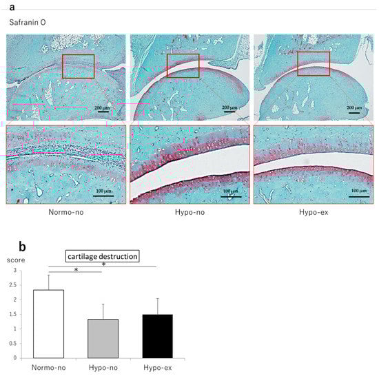 To evaluate the histological effects on the joints, rat ankle cartilage samples on day 44 were stained with safranin O. In the Normo-no group, irregularly shaped articular cartilages, cartilage thinning, and decreased safranin O staining were observed, and the cartilage destruction scores in this group were higher than the Hypo-no and Hypo-ex groups (p < 0.05; Figure 2a,b).