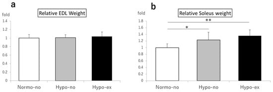 No significant difference in the relative extensor digitorum longus (EDL) weight was found among the groups (Figure 3a). However, the relative soleus weight values in the Hypo-no and Hypo-ex groups were 1.23- and 1.36-fold higher than the Normo-no group (p < 0.05 and p < 0.01, respectively; Figure 3b).