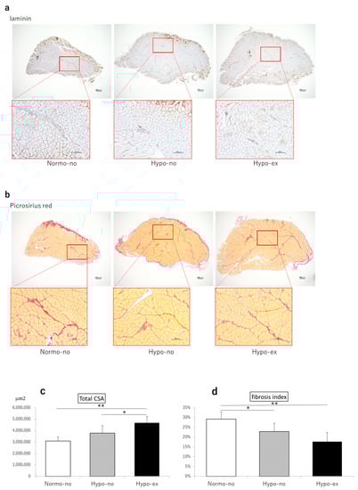 To histologically evaluate the muscles of each group, we performed laminin and picrosirius-red staining of the soleus muscle (Figure 4a,b). The relative muscle cross-sectional area of the soleus in the Hypo-ex group was significantly increased compared to the Normo-no and Hypo-no groups (1.52- and 1.24-fold, p < 0.01 and p < 0.05, respectively; Figure 4b). The fibrosis rates of the soleus muscles in the Hypo-no and Hypo-ex groups were 22% and 40% less than the Normo-no group (p < 0.05 and p < 0.01, respectively; Figure 4c).