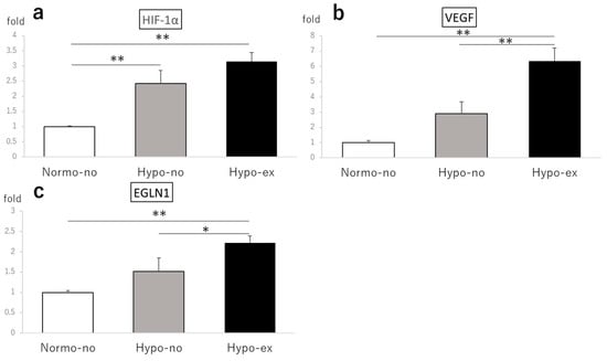 HIF-1α (a), VEGF (b), and EGLN1 (c) mRNA levels in the soleus muscle on day 2 were analyzed using a quantitative reverse-transcription polymerase chain reaction after a single bout of treadmill running. Each value represents the mean ± standard deviation. * p < 0.05, ** p < 0.01. EGLN1, egl-9 family hypoxia-inducible factor 1; HIF-1α, hypoxia-inducible factor-1α; VEGF, vascular endothelial growth factor. n = 4 in each group.