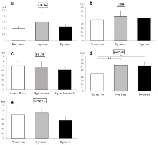 On day 2, the HIF-1α expression levels in the soleus muscles of the Hypo-no and Hypo-ex groups were 2.43- and 3.15-fold higher than the Normo-no group (p < 0.01; Figure 5a). Likewise, the expression levels of vascular endothelial growth factor (VEGF) in the Hypo-ex group were elevated compared to the Normo-no and Hypo-no groups (6.35- and 2.19-fold, respectively, p < 0.01; Figure 5b), as were the expression levels of the egl-9 family hypoxia-inducible factor 1 (EGLN1) in the Hypo-ex group compared to the Normo-no and Hypo-no groups (2.22- and 1.47-fold, p < 0.01 and p < 0.05, respectively; Figure 5b,c). By contrast, no significant differences in soleus expression levels of HIF-1α, VEGF, and atrogin-1, a marker of muscle protein degradation, among experimental groups were observed on day 44 (Figure 6a–c,e). However, the expression of p70S6K, a marker of muscle protein synthesis, was significantly higher in the Hypo-no (1.49-fold) and Hypo-ex (1.46-fold) groups than the Normo-no group (p < 0.05 and p < 0.01, respectively; Figure 6d).