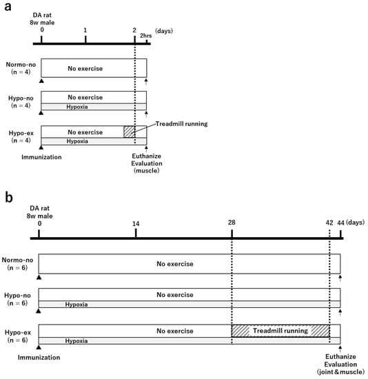 Experimental protocols. Eight-week-old male DA CIA rats were randomly divided into three groups: the Normo-no, Hypo-no, and Hypo-ex groups. Rats were euthanized 2 h after a single bout of treadmill running on day 2 (a) or 48 h after the final treadmill exercise on day 42 (b). Gene expression and histological analyses were performed to evaluate the effects of treadmill running on ankle joints, as well as fast- and slow-twitch muscles. CIA, collagen-induced arthritis; DA, Dark Agouti; Normo-no, normoxia no-exercise; Hypo-no, hypoxia no-exercise; Hypo-ex, hypoxia-exercise; w, week.