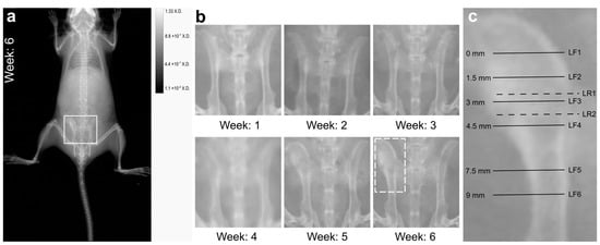 X-ray imaging was done weekly during the six week course of infection to detect any changes in bone structure. In the first week after infection, no pathological transformation could be observed. However, as visible in Figure 1a, severe bone deformations with thickening of the ilium were clearly visible in the left pelvis six weeks after infection. Figure 1b highlights the changes occurring in the pelvis region during progression and manifestation of the infection. No major alterations were seen in the 2D X-ray image of the right pelvis.