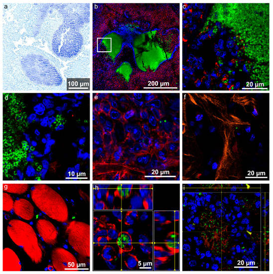 The muscle fibers attached to the periosteum of the bone were characterised by strong actin staining (Figure 2, 1st row). Trabecular bone tissue showed a typical porous network structure with the blue-stained nuclei of the cells in the trabecular spaces and a surrounding bone matrix which appeared dark in the fluorescence images. The shape and size of trabecular bone tissue varied between slices LF1 and LF4. While it formed a well-defined region with homogenous trabecular structure in section LF1, large lesions were visible in the trabecular bone in slices LF2–LF4. The lesions were characterised by a relatively high density of nuclei and intense phalloidin staining of the actin-cytoskeleton, which let these regions appear pink in Figure 2. The lesions made up a significant portion of the bone tissue across all slices. It was found either surrounded by trabecular bone (slices LF2, LF3, LF4) or outside of the trabecular bone (slices LF1, LF2). In slice LF2 and LF3, the lesions seemed to break through the regular trabecular structure and infiltrated it (Figure 2, LF3 is enlarged in Figure 3i). The large size of the lesion may have caused the tissue deformation that was observable in X-ray imaging (Figure 1) and during the macroscopic examination after the bone was prepared.