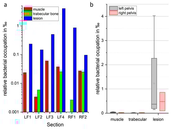 Visualization of bacterial count in the different tissue slices from semi-automated analysis of fluorescence images. (a) Relative bacterial occupation (on y axis) of selected tissue types in the individual slices labelled on the x axis. Please note, the y-axis is given in logarithmic scale. Colour codes for tissue region: red: muscle, green: trabecular bone, blue: lesion (when no bar is shown, no bacteria were found in the respective tissue). (b) Box plot comparing relative bacterial occupation in the selected tissue types of left and right pelvis from the data of the single slices in (a). x-axis: tissue type (grey for left and red for right pelvis), □: mean, central horizontal line: median, upper box line: median 1st quartile, lower box line: median 3rd quartile, error bars: maximal and minimal value. Please note, as there were only 2 slices from right pelvis analysed, there are no error bars on the boxes. (For further information see Supplementary Table S3).