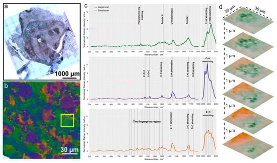 Raman spectroscopic analysis of the lesion. (a) Bright field overview image of pelvis section LR1 used for Raman imaging. The small white square indicates the region subjected to Raman imaging. (b) False colour Raman image using N-FINDR analysis with intensity-normalised Raman data. (c) Endmember (EM) spectra, top row: EM 1, middle row: EM2, and bottom: EM 3. The EM1 of the small scan (dashed line) in also provided in the top row to show the similarities between the two. (d) High-resolution 6-layer 3D Raman scan performed in the region highlighted with a yellow square in panel (b).