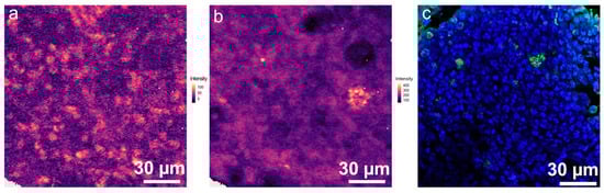 Spectral contributions of nucleic acids were rather low in all endmember spectra. However, they are expected to be present in cell nuclei and also within bacteria. Therefore, false colour Raman images were generated visualizing the relative intensity of the nucleic acid bands at 788 cm−1 (Figure 7a) and 1580 cm−1 (Figure 7b) using non-normalised Raman data. In Figure 7a bright regions of around 5 µm are visible, which could be the cell nuclei of the host cells. In the heatmap for the Raman band at 1580 cm−1 (Figure 7b), similar features are visible as in EM1 (Supplementary Figure S9). With especially high intensity values structures in the size of typical bacteria were visible. After finishing the Raman measurements, bone section LR1 was subjected to fluorescence staining (Supplementary Figure S12 and Figure 7c). It has to be noted that due to technical issues, not the exact very same position is depicted as used for Raman imaging. However, the overall distribution of nuclei and bacterial signal shows excellent agreement with the false colour Raman images (Figure 7). The distribution of the cell nuclei in the fluorescence image resembles the false colour Raman map using nucleic acid distribution in Figure 7a. The bacteria are visualised with specific fluorescent antibodies in Figure 7c and are found throughout the lesion supporting our assignment discussed above.