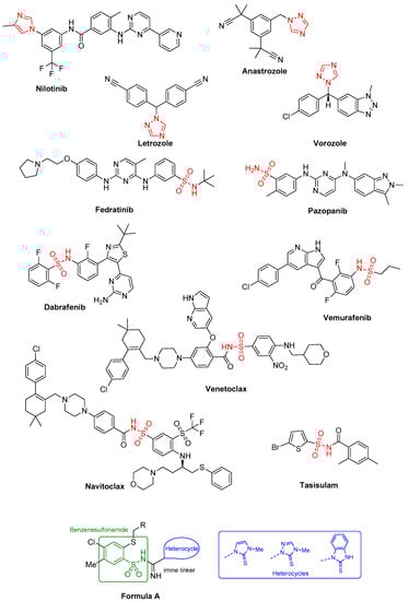 Various sulfonamide compounds are used in anticancer therapies (Figure 1). Sulfonamide drugs such as fedratinib (Janus kinase inhibitor) [32], pazopanib (VEGFR growth receptor inhibitor) [33], dabrafenib [34], and vemurafenib (NCT04302025) (which are inhibitors of BRAF V600 protein) lead to the inhibition of cancer cell division. For example, vemurafenib is used as a targeted monotherapy to treat melanoma with a mutation in the BRAF V600 protein [35]. Venetoclax [36], navitoclax [37] and tasisulam [38] are drugs that induce apoptosis.