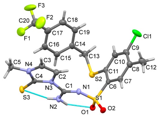 Compound 10 crystallized in the space group P21/c with one molecule in the asymmetric unit. Details on data collection, structure solution and refinement are reported in Table S1 (Supplementary Materials). A molecular view is presented in Figure 2. In the solid state, the molecule is deprotonated in the sulfonamidic part, and the hydrogen atoms H2a and H2b are located on the amine nitrogen atom N2. They form hydrogen bonds with the neighbor O1 and S3 (for details, see Table S2 in Supplementary Materials). No distinct electron density peak was found in the vicinity of the sulfonamide nitrogen atom N1. Additionally, the CF3 group was found disordered over two positions, with a site occupation factor of 0.58(2)/0.42(2).